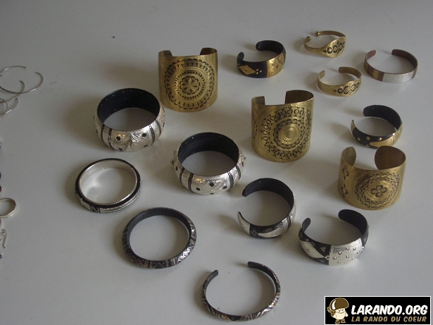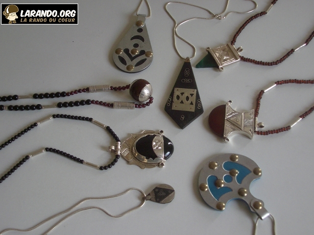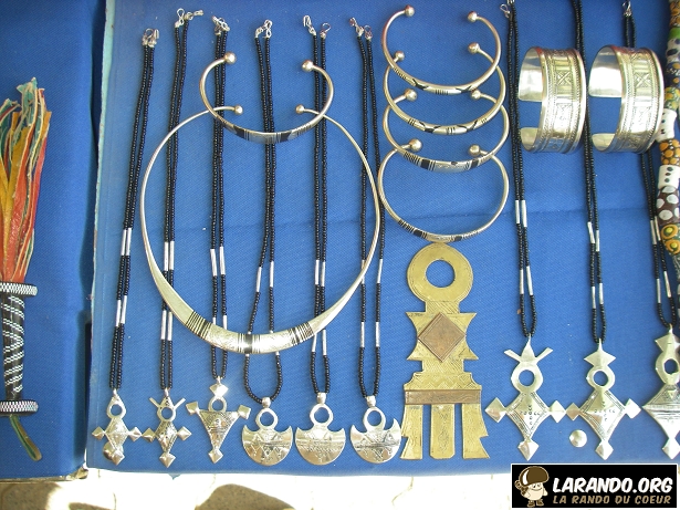 rando désertLes Touaregs (qui se nomment eux-mêmes Kel Tamashaq ou Kel Taguelmust en Amazigh) sont des habitants du Sahara central et de ses bordures (Algérie, Libye, Niger, Mali, et Burkina Faso). Souvent nomades, leur sédentarisation s’accélère depuis la seconde moitié du XXe siècle. Ils utilisent un alphabet appelé tifinagh (prononcer tifinar).  La Rando du Coeur s’intéresse, cette fois-ci à leur artisanat. ISSOUGHAN, Qui signifie « Bijoux » en tamashek. Découvrez les photos de l’artisanat à Tamanarasset en Algérie.