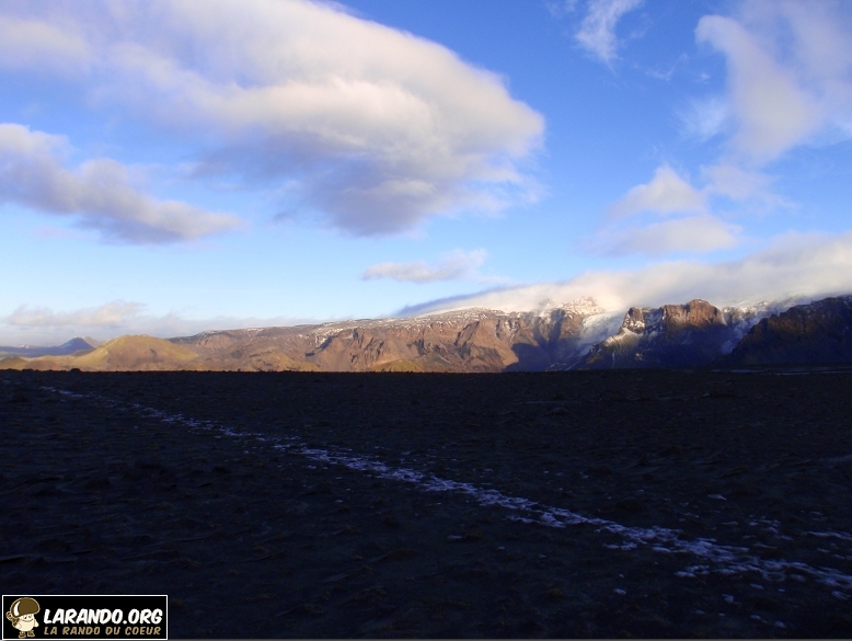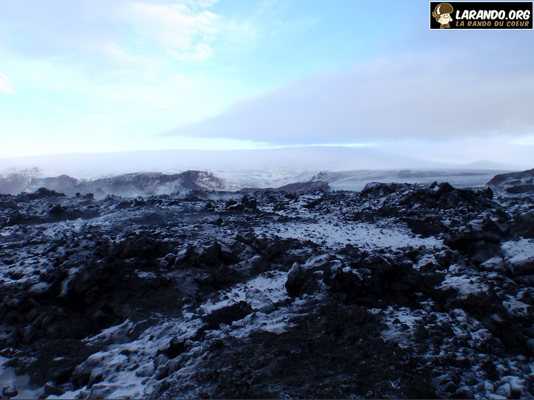 J’ai pris le chemin Fimmvörduhals, pour traverser la coulée de lave qui s’est répandu sur le col en mars-avril dernier 2010. J’ai eu l’occasion de monter sur son cratère, avec de la lave encore chaude (>800 °C à une vingtaine de cm au dessous de la surface). Il s’agit d’un des volcans les plus actifs et des plus destructeurs d’Islande, à l’origine de plusieurs jökulhlaups. Le Katla est constitué d’une montagne couronnée par une caldeira, appelée Kötlugjá, de quatorze kilomètres de longueur pour dix kilomètres de largeur orientée dans le sens nord-ouest-sud-est. Le point culminant du Katla avec 1 512 mètres d’altitude est constitué d’un des rebords de cette caldeira. Découvrez les photos de cette belle randonnée en Islande.